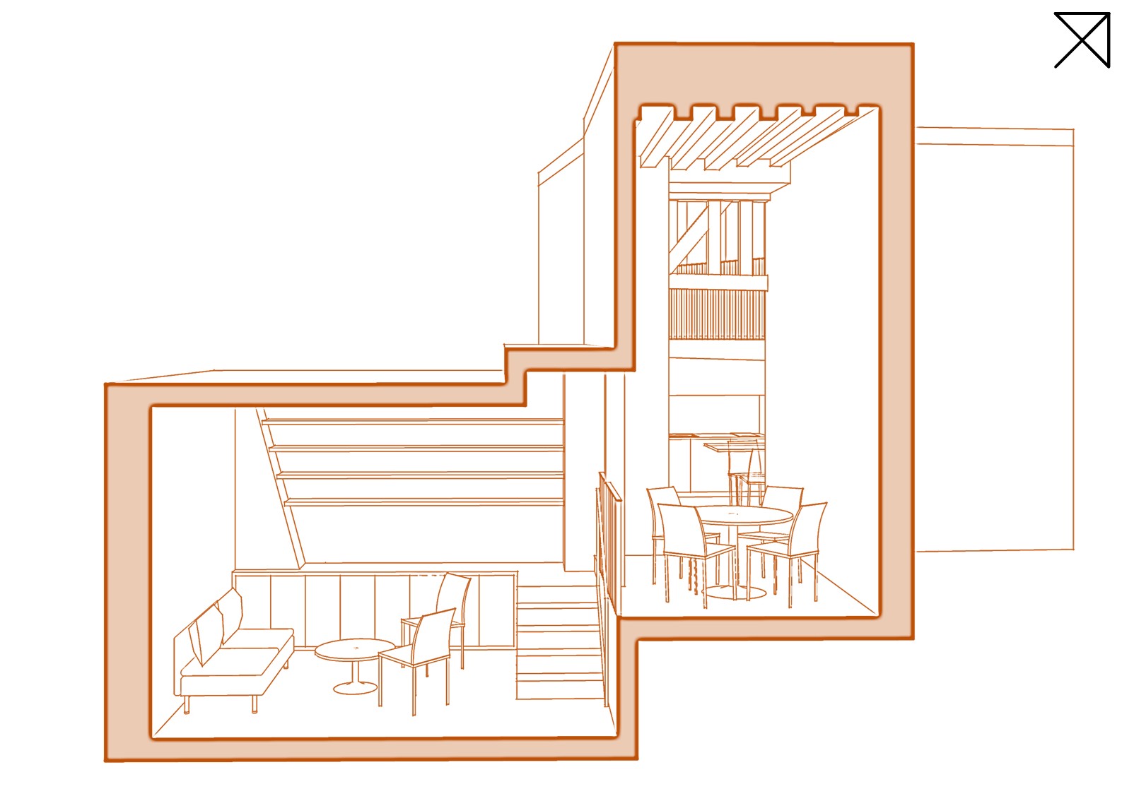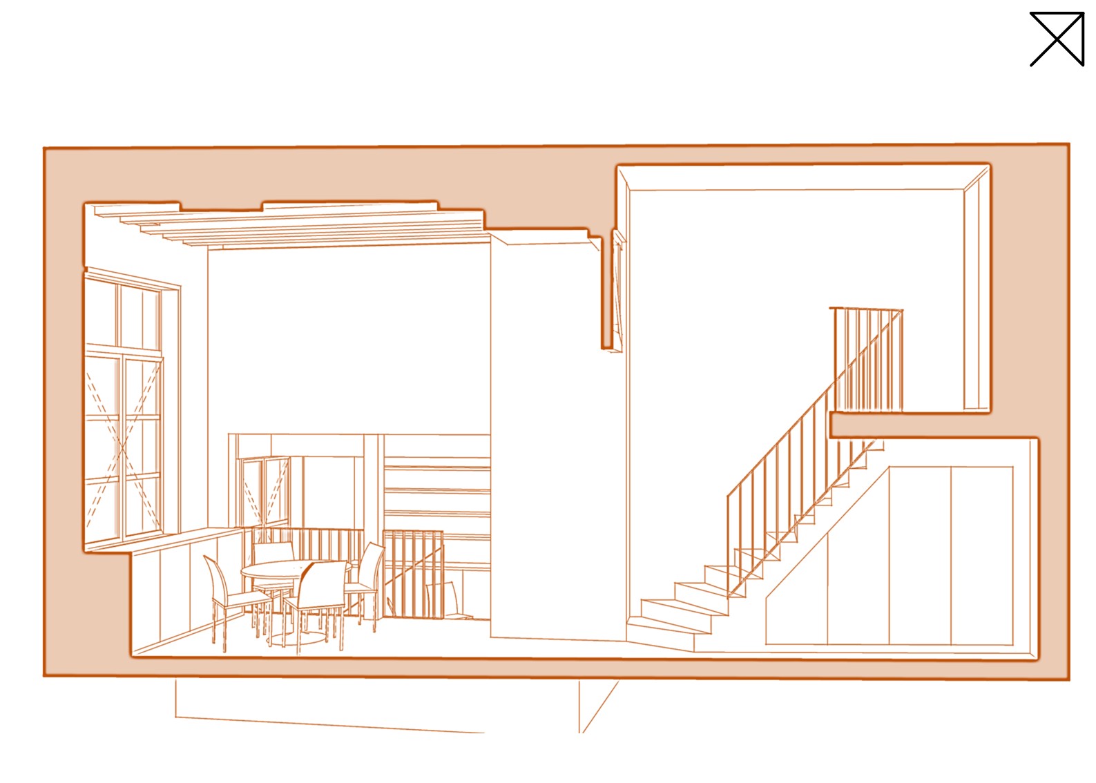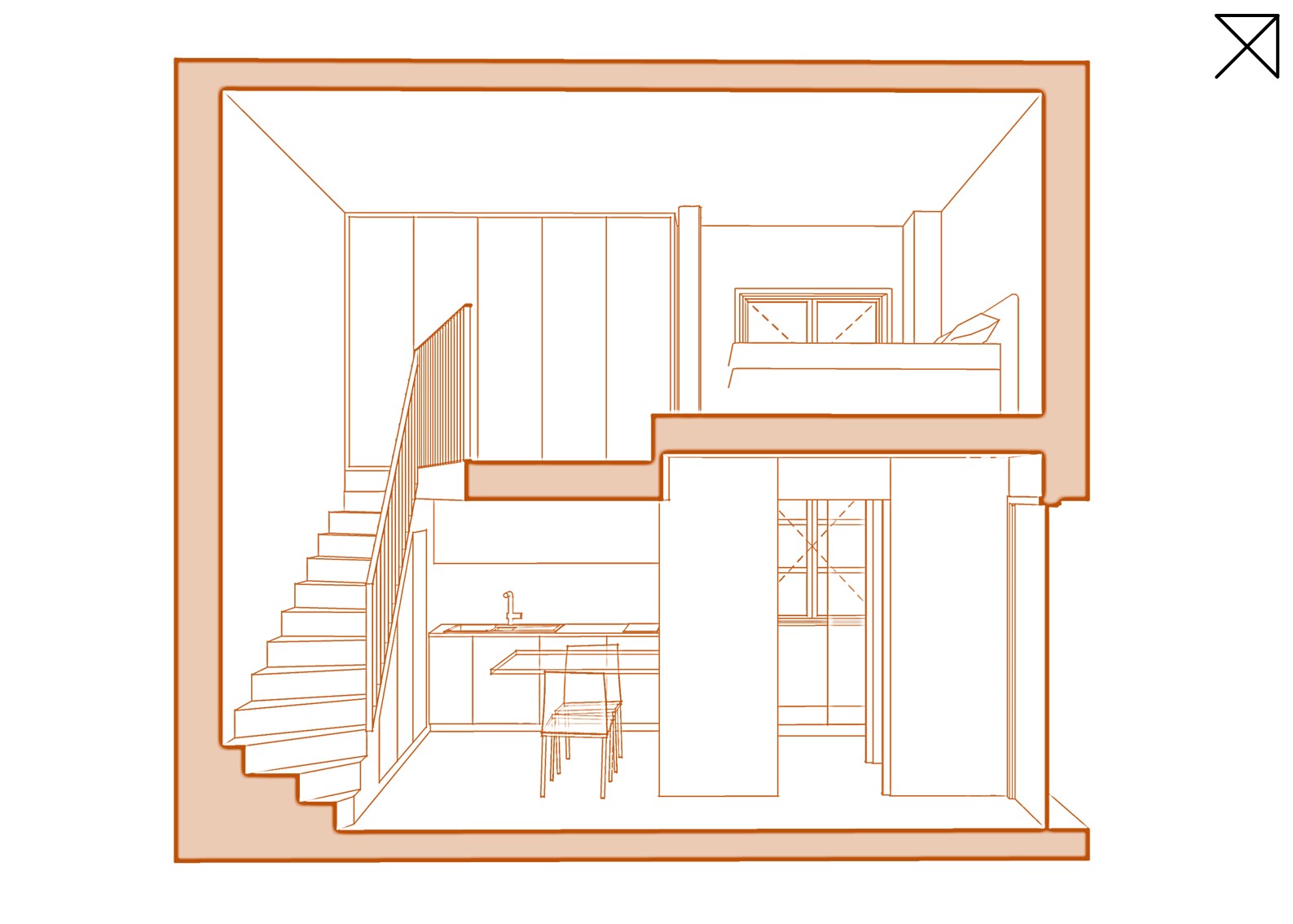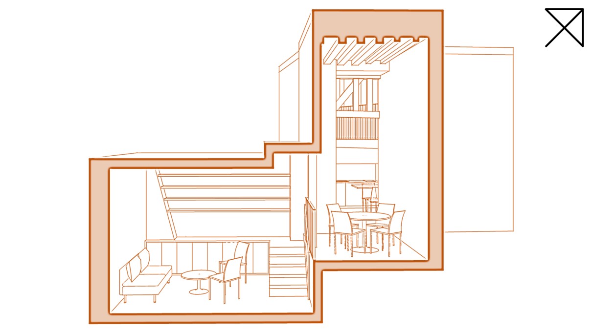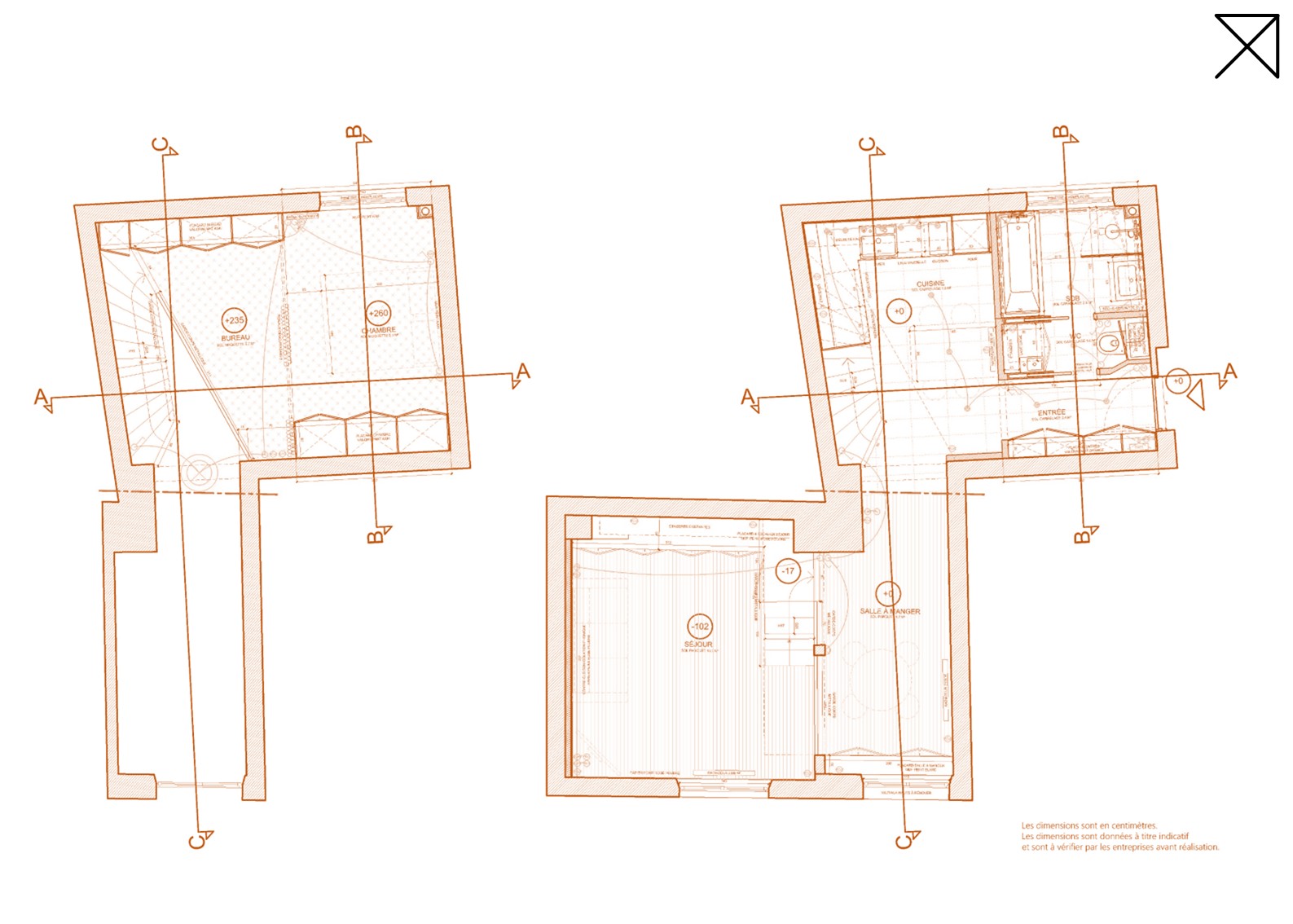 Le projet prévoit un cloisonnement minimal. Il s’agit de cloisonner ce qui doit l’être – la salle de bain, les sanitaires – tout en laissant les volumes ouverts et l’espace fluide. L’idée est de créer un loft avec des espaces différenciés dans leur fonction, en jouant sur les différents niveaux et les recoins : entrée, séjour, salle à manger, cuisine, salle de bain avec douche et baignoire, WC séparés, chambre et coin bureau en mezzanine.