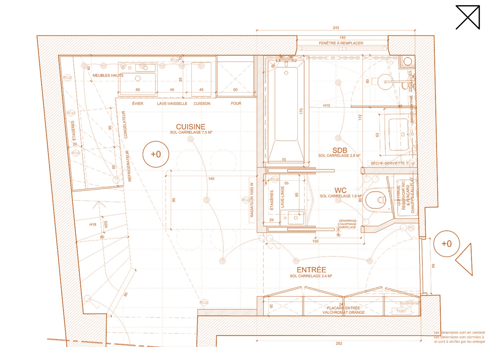 Les teintes claires permettent d’agrandir visuellement l’espace : murs dans un blanc légèrement cassé, parquet en chêne naturel. Quelques couleurs d’accentuation singularisent et dynamisent les espaces : un orange cuivré et chaleureux pour l’entrée et les pièces d’eau ; un vert lichen tendre pour l’espace nuit ; un gris anthracite et un grège taupe pour la cuisine.